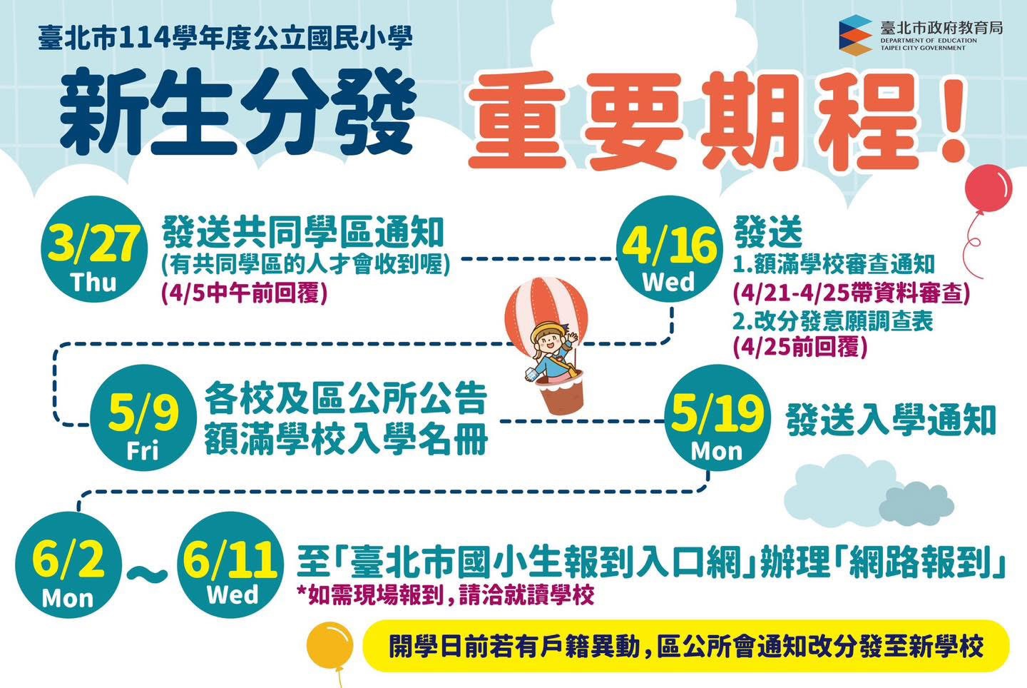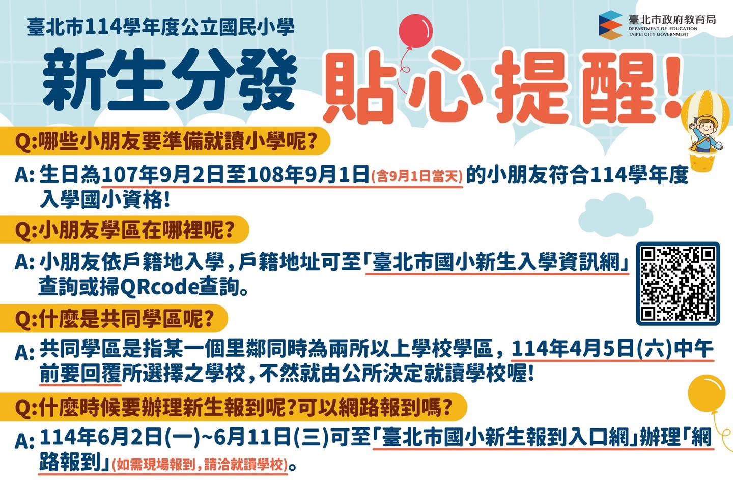 I. Please pay attention to the enrollment schedule for first-grade new students in Taipei City for the 114th academic year: