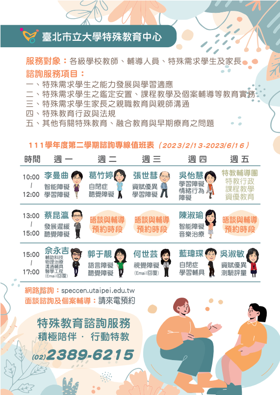 臺北市立大學特殊教育中心提供特殊教育諮詢服務,