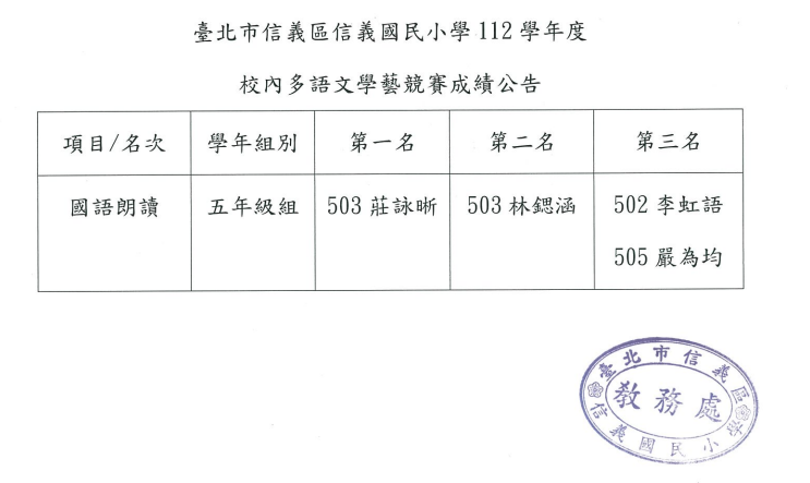 三、恭喜獲獎同學,將擇期於兒童朝會頒獎。