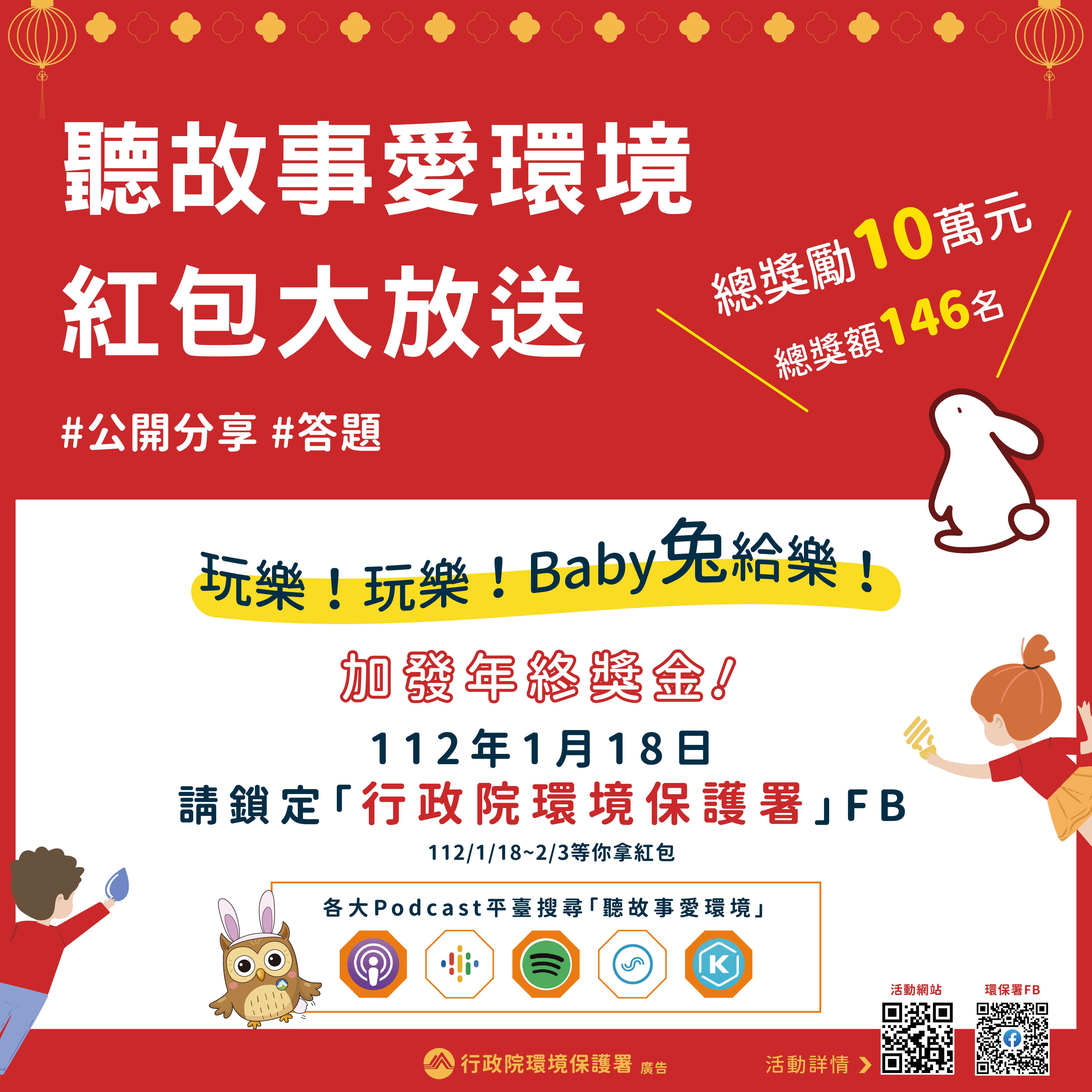 三、為增進「聽故事愛環境」節目效益,於農曆新年期間辦理旨揭活動,本活動期間為112年1月18日(星期三)至2月3日(星期五),只要至「行政院環境保護署」臉書粉絲專頁完成指定「任務題」或「知識題」,即可有機會抽中超商禮券或環保綠點,總獎額146名,總獎值高達新臺幣 10萬元。