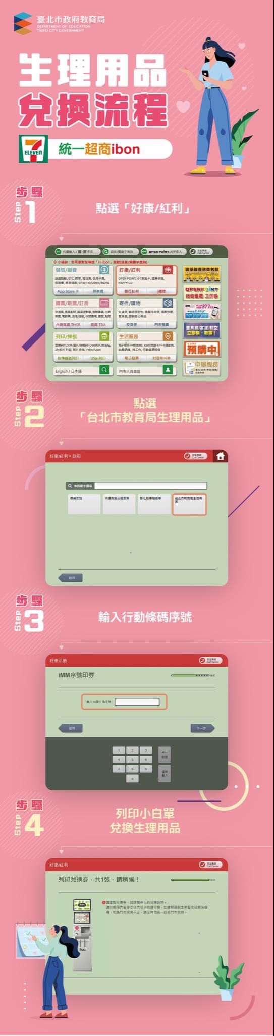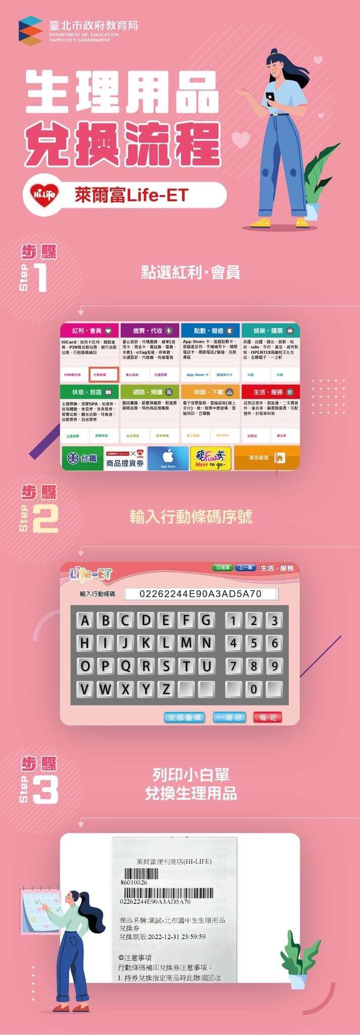 一、「112年國中小女性生理用品補助計畫」第1期兌換券2張,將於3月1日發放,兌換效期至112年4月30日止。兌換方式與流程,重點摘述如下: