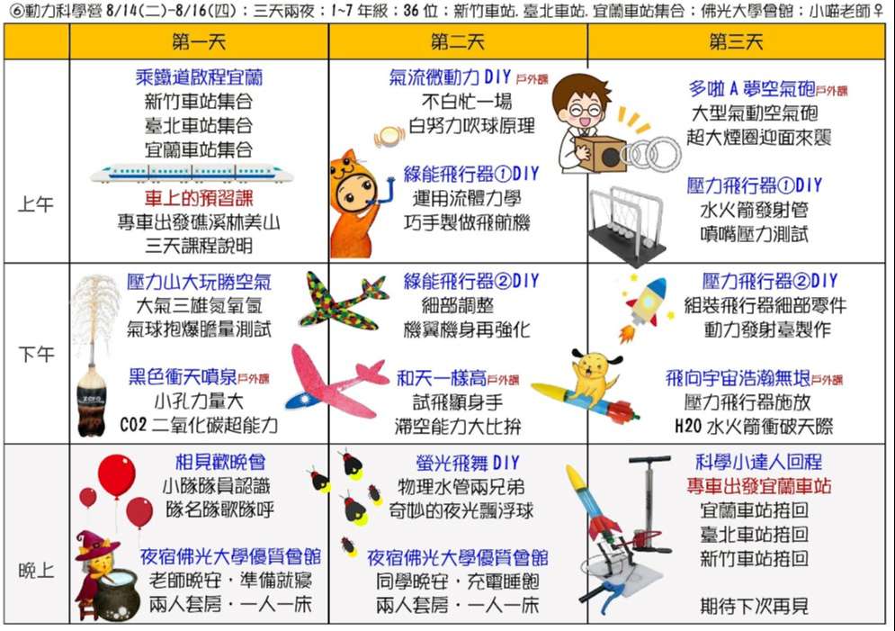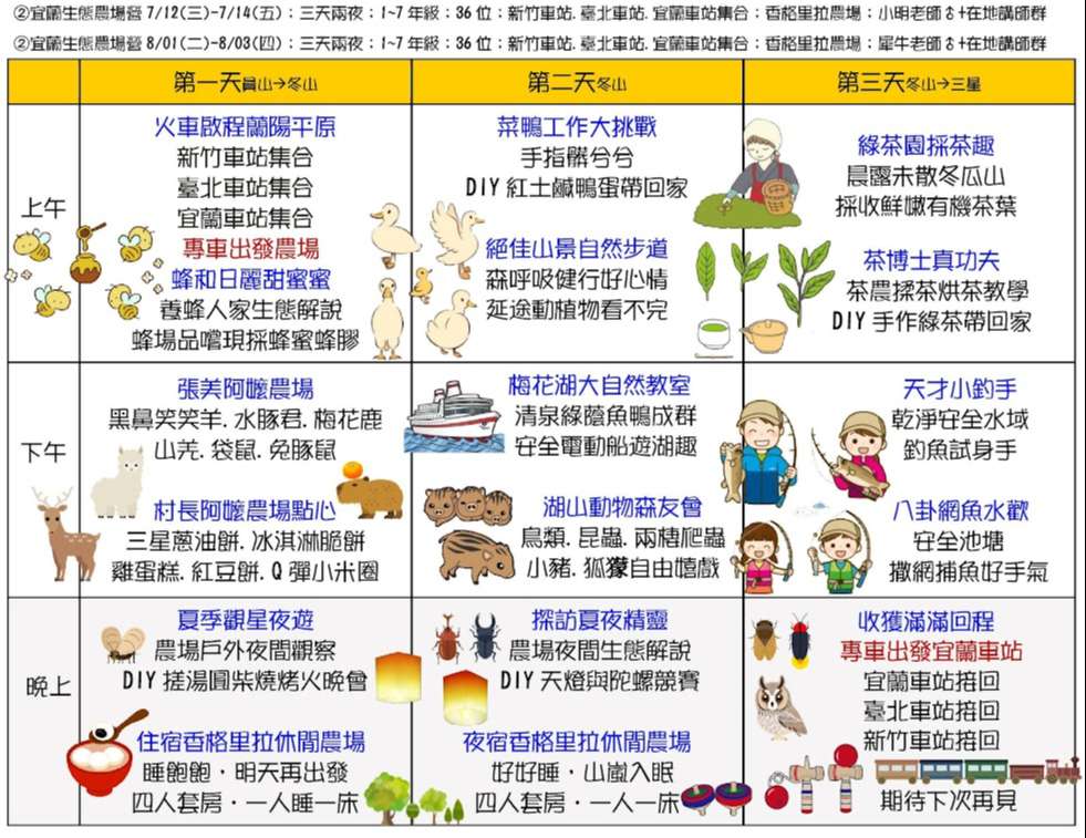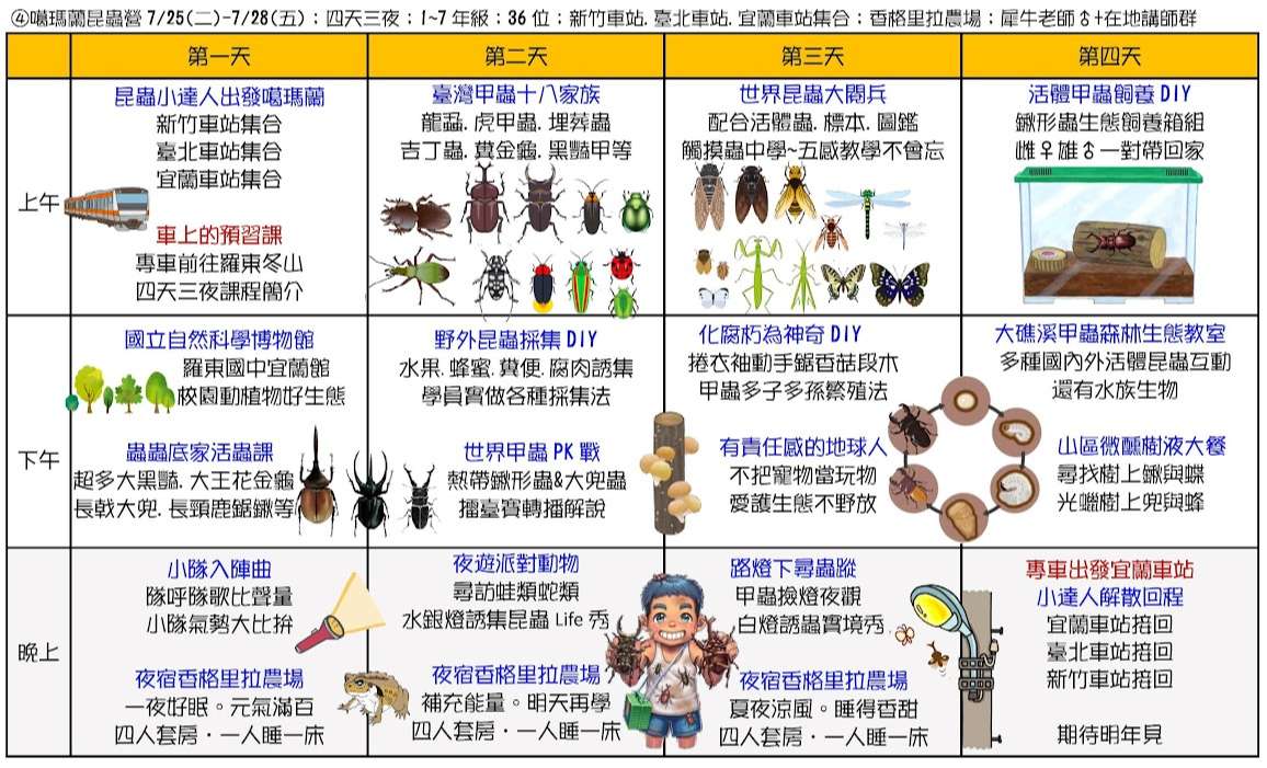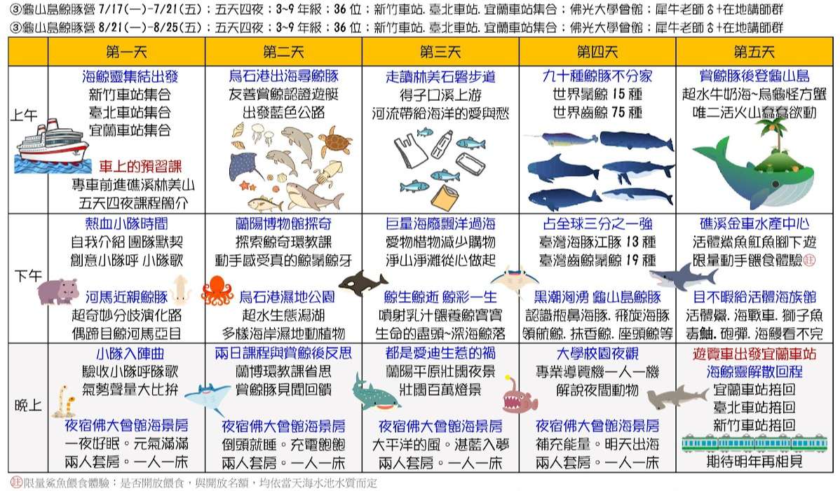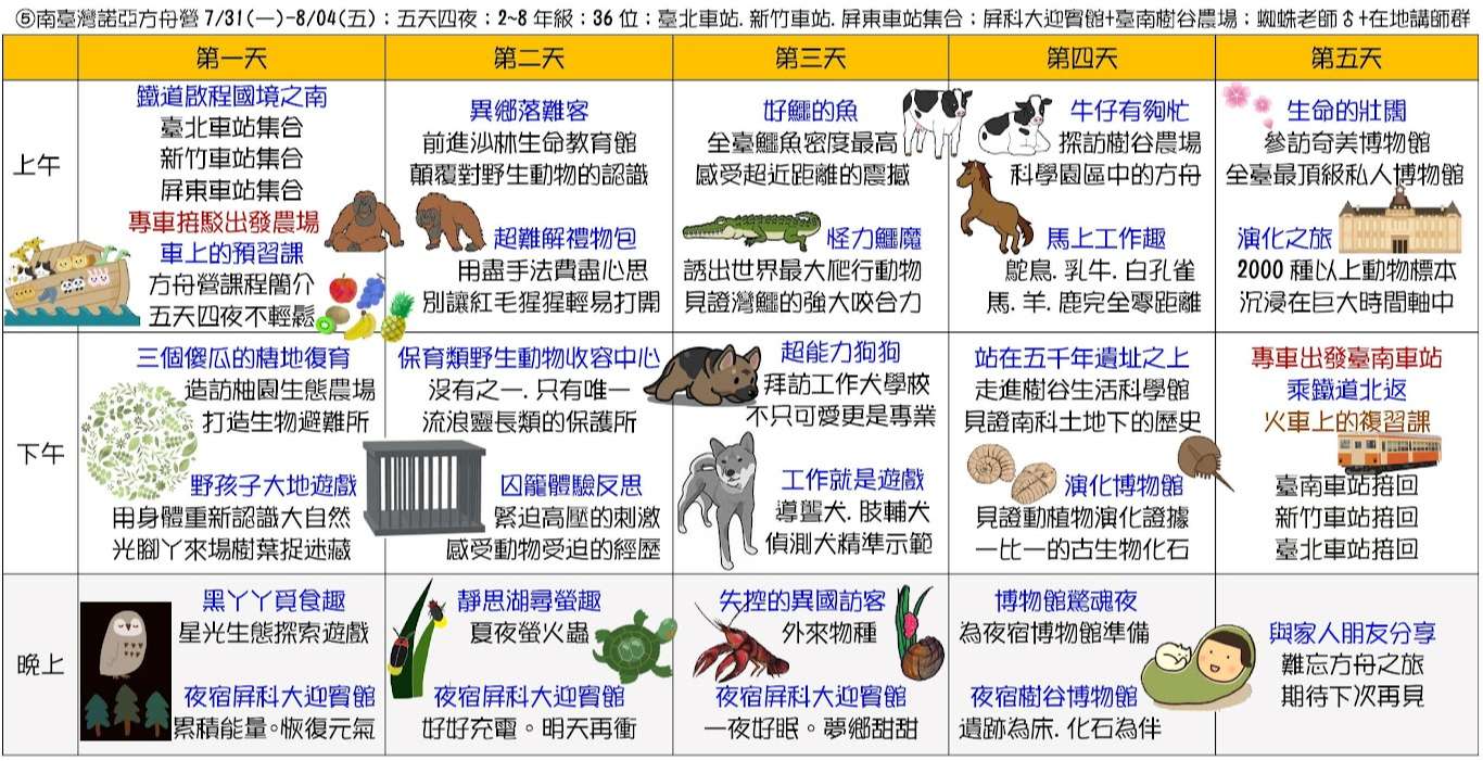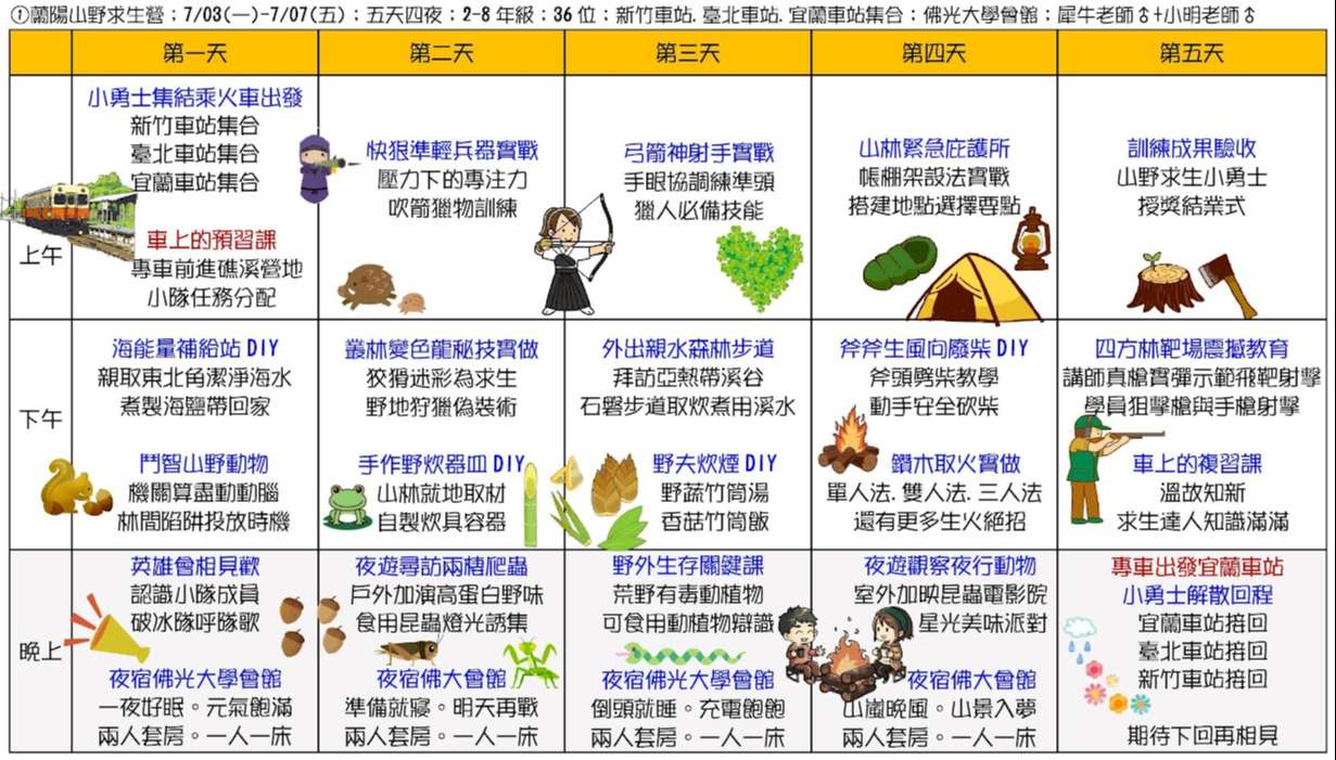 三、課程主題:蘭陽山野求生營(五天四夜)、宜蘭生態農場營(三天兩夜)、龜山島鯨豚營(五天四夜)、噶瑪蘭昆蟲營(四天三夜)、南臺灣諾亞方舟營(五天四夜)、動力科學營(三天兩夜)。