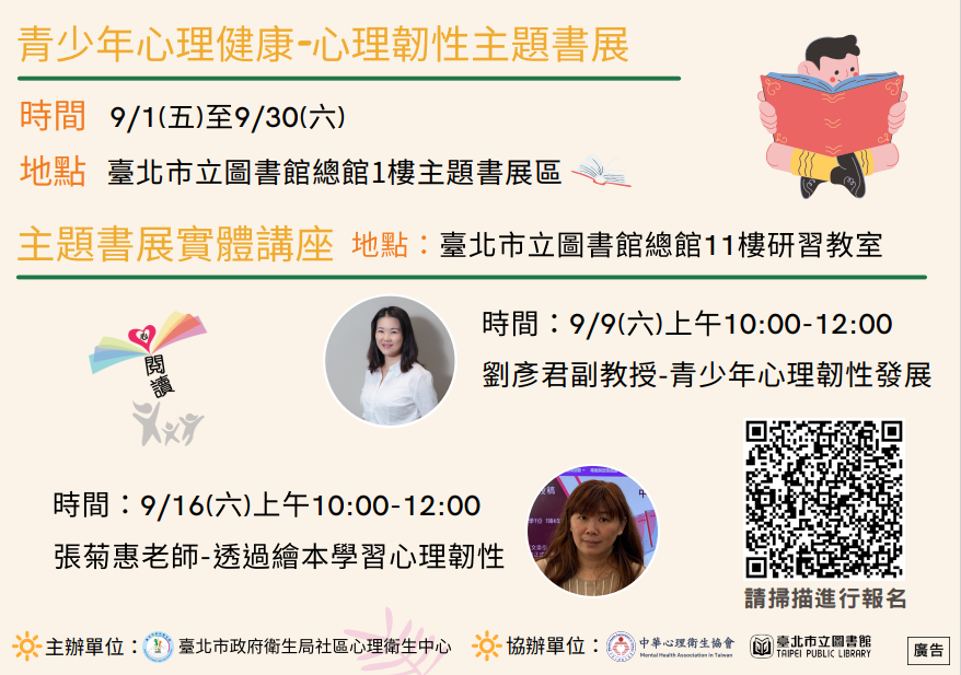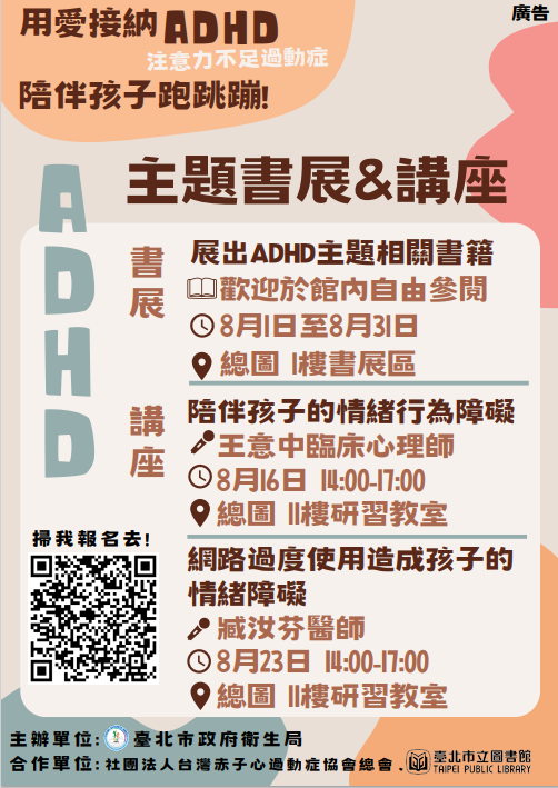 二、為促進青少年心理健康及注意力不足過動症相關知能,本局於8-9月辦理旨揭活動,活動資訊摘述如下: