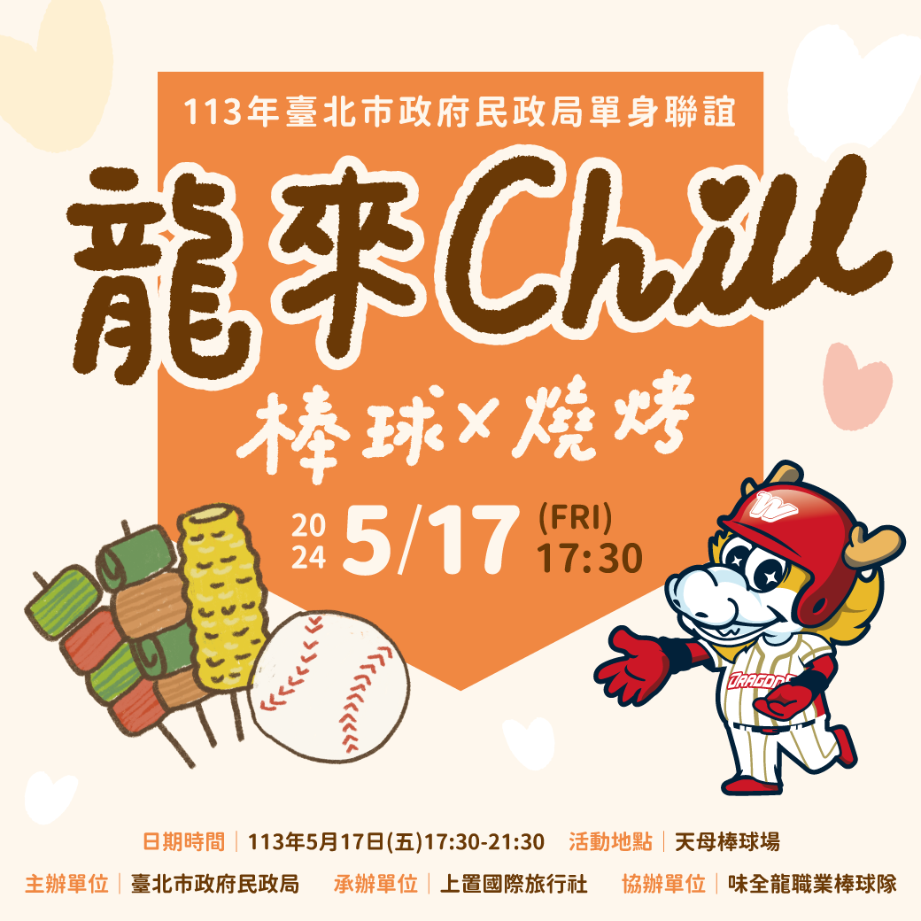 臺北市政府民政局辦理「龍來chill」棒球燒烤主題聯誼,訂於113年5月17日下午5點30分在天母棒球場辦理,凡對棒球主題有興趣、25-45歲單身朋友皆可報名。詳情請參閱臺北市鼓勵婚育專區:https://loveactually.gov.taipei/