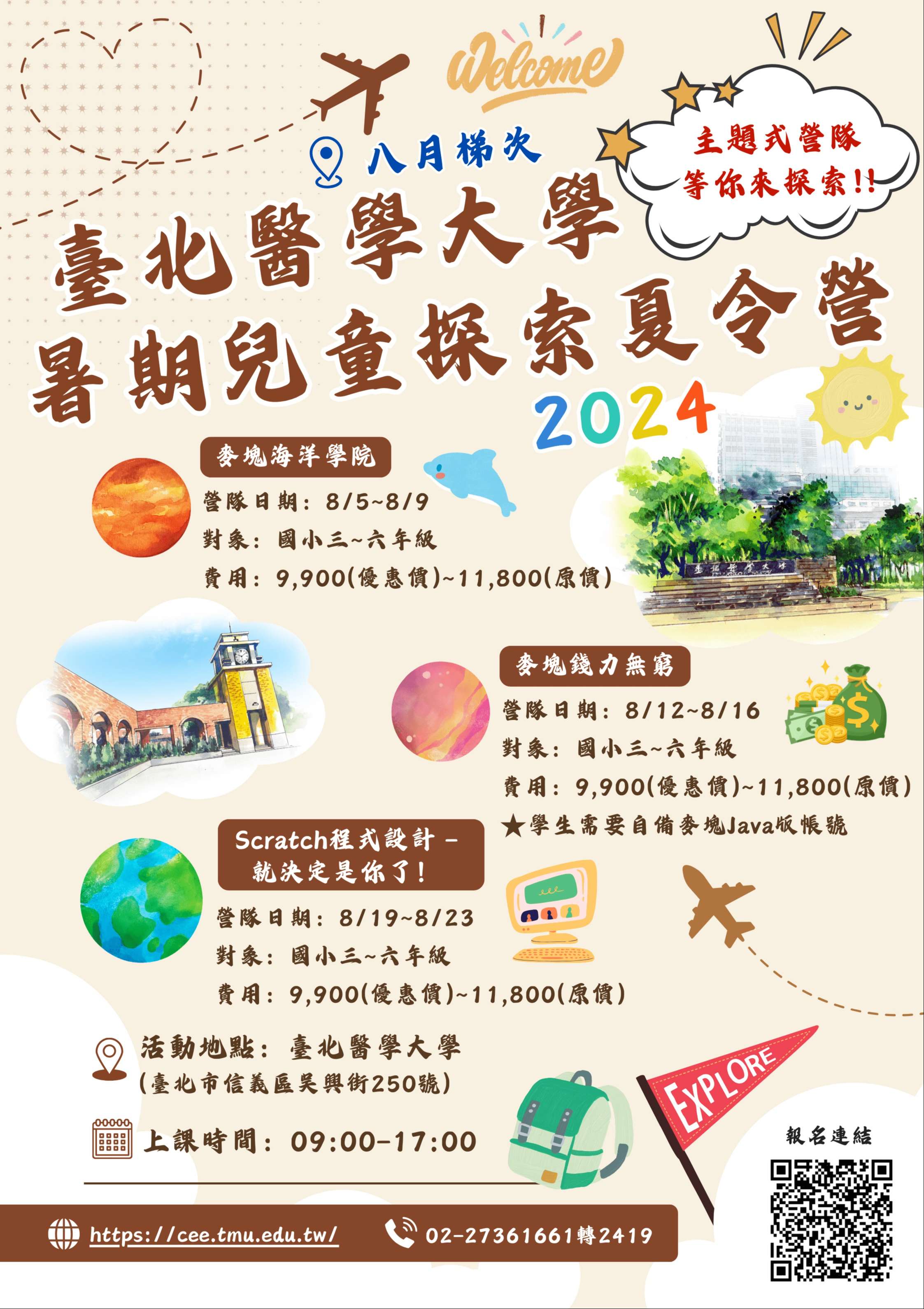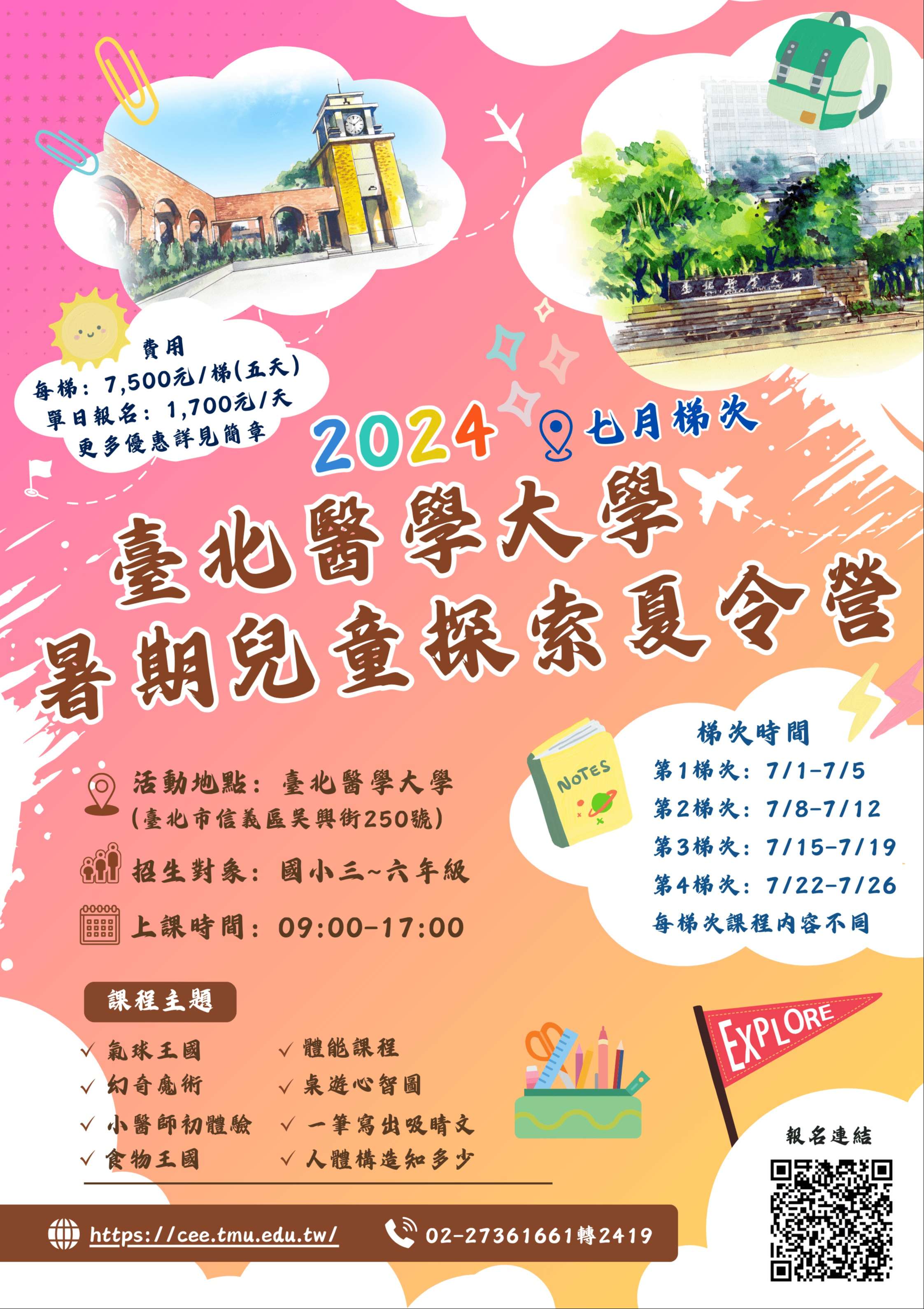 二、營隊資訊:2024臺北醫學大學暑期兒童探索夏令營擬訂於 民國113年7月1日至8月23日辦理。網址 http://tmucamp. tmu.edu.tw/