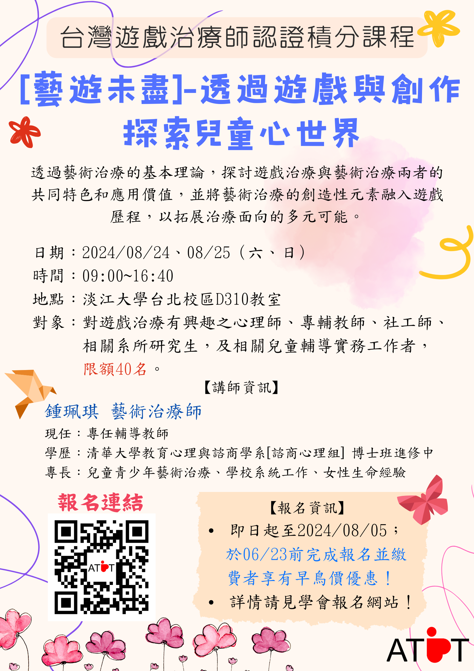 一、2024台灣遊戲治療師認證積分課程【2024台灣遊戲治療師 認證積分課程】:「藝遊未盡-透過遊戲與創作探索兒童心 世界」課程時間及講師資訊。