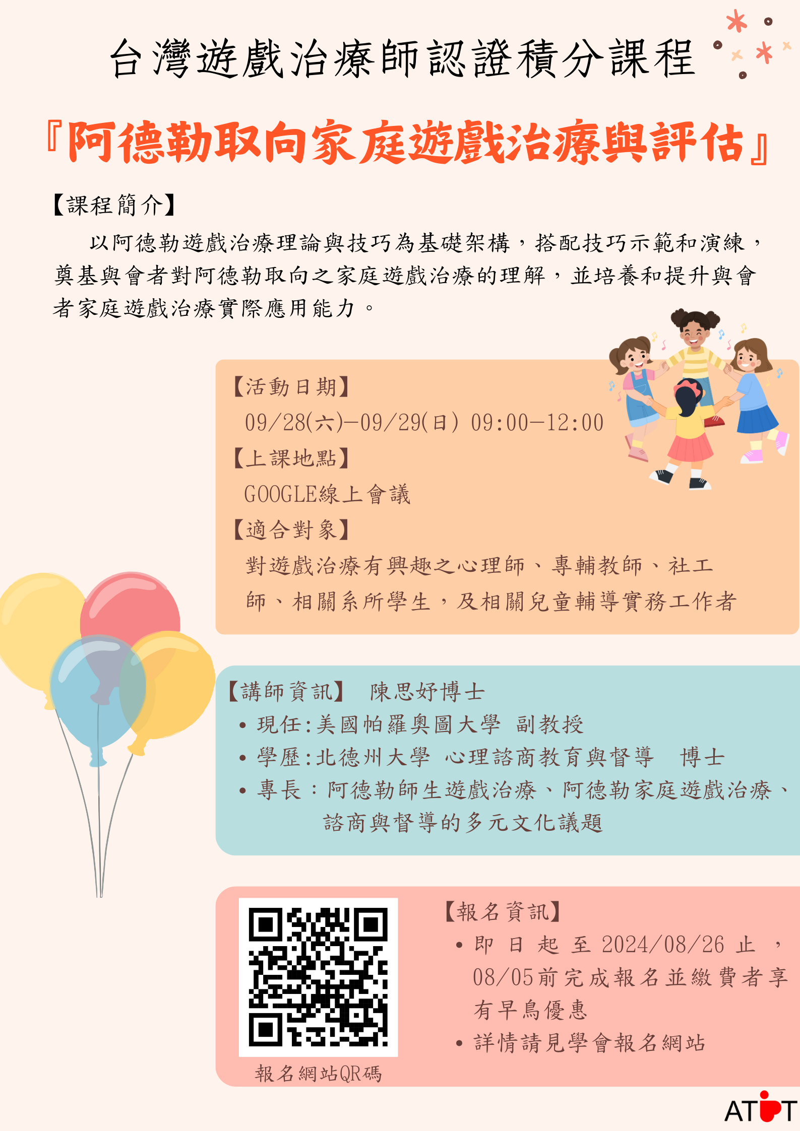 一、【2024台灣遊戲治療師認證積分課程】阿德勒取向家庭遊