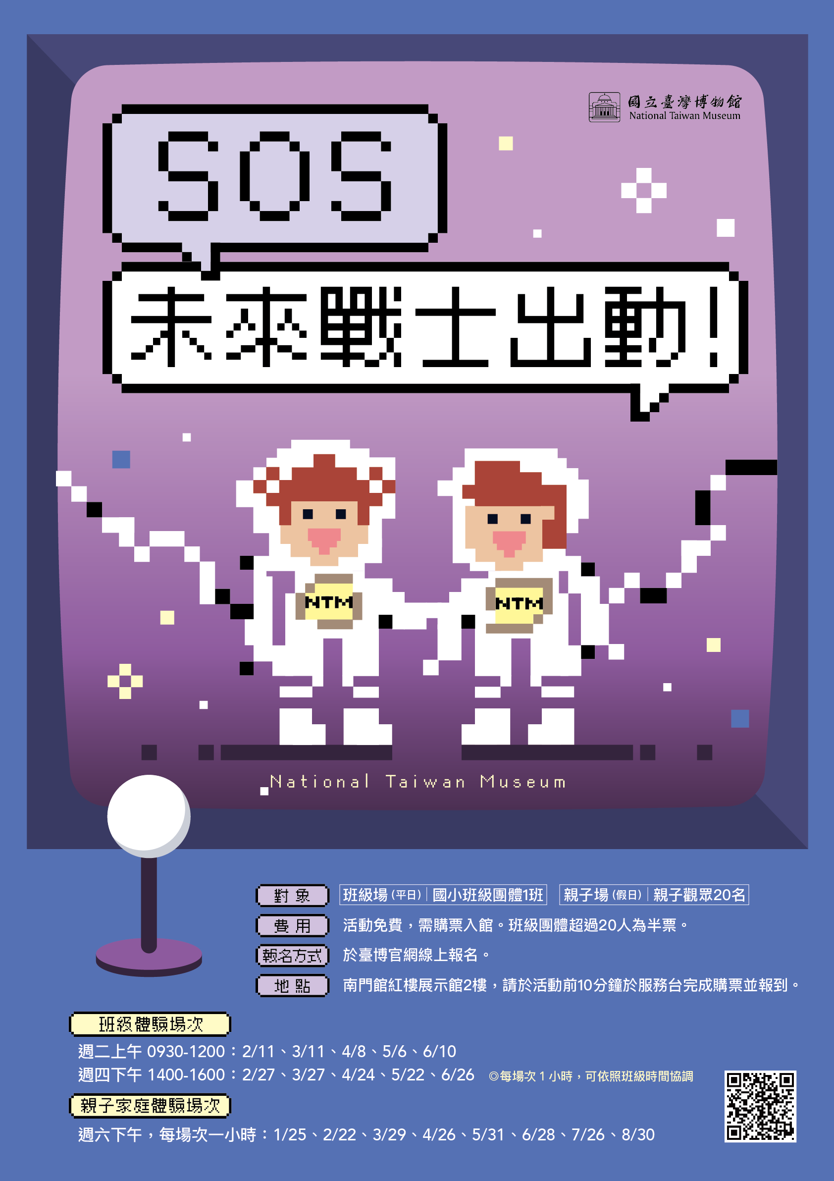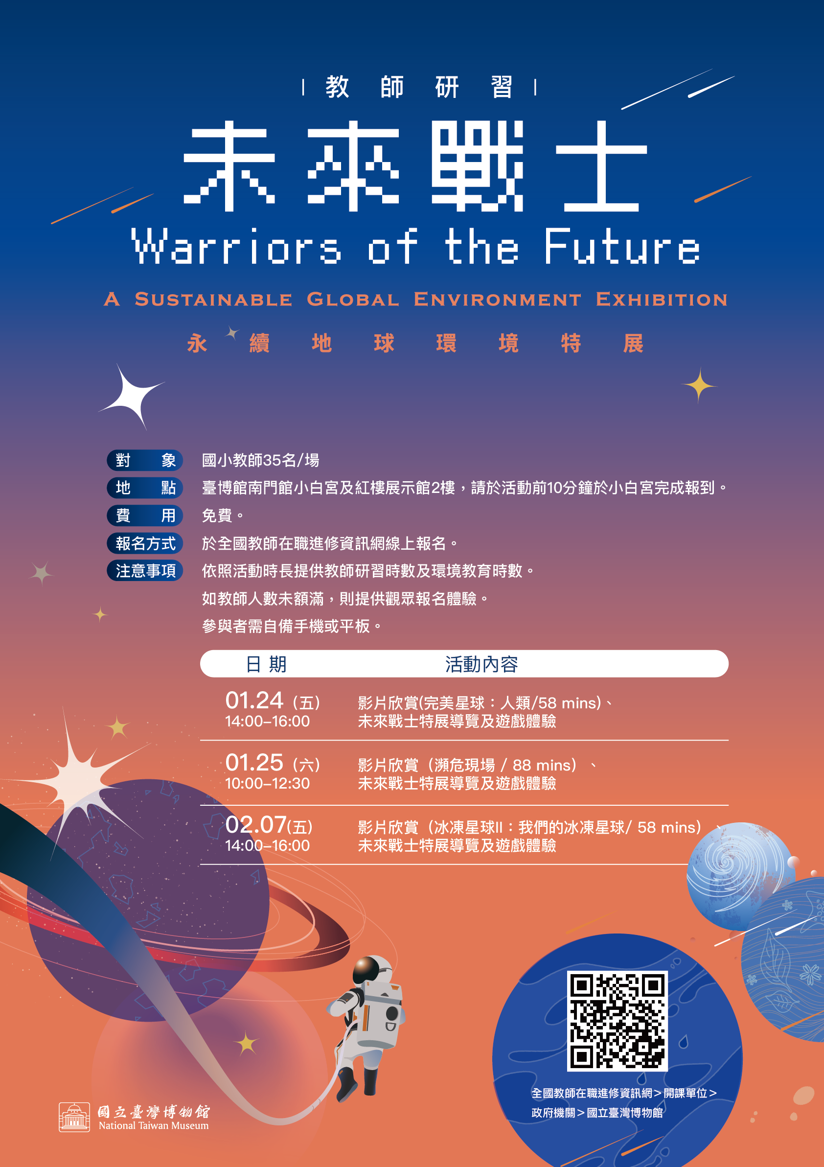 說明: 一、旨揭特展以親子及國小學童為主要對象,聚焦大氣、水、 陸地及生物圈等32項地球環境危機,邀請觀眾化身「未來 戰士」,在科技互動遊戲中探索人類對環境的影響,並尋 求永續發展解方。 二、本館訂於114年1月24日(星期五)、1月25日(星期六)及2月7 日(星期五)假南門館(臺北市中正區南昌路一段1號)辦理三 梯次教師研習課程,請轉知所屬並鼓勵教師報名參加。參 與研習之教師,將依課程時長核發研習及環境教育時數。 三、研習每場次限額35人,即日起於全國教師在職進修資訊網 開放報名,詳情請參閱附件簡章或本館藝文活動平台頁面 (https://pse.is/6wfuba)。
