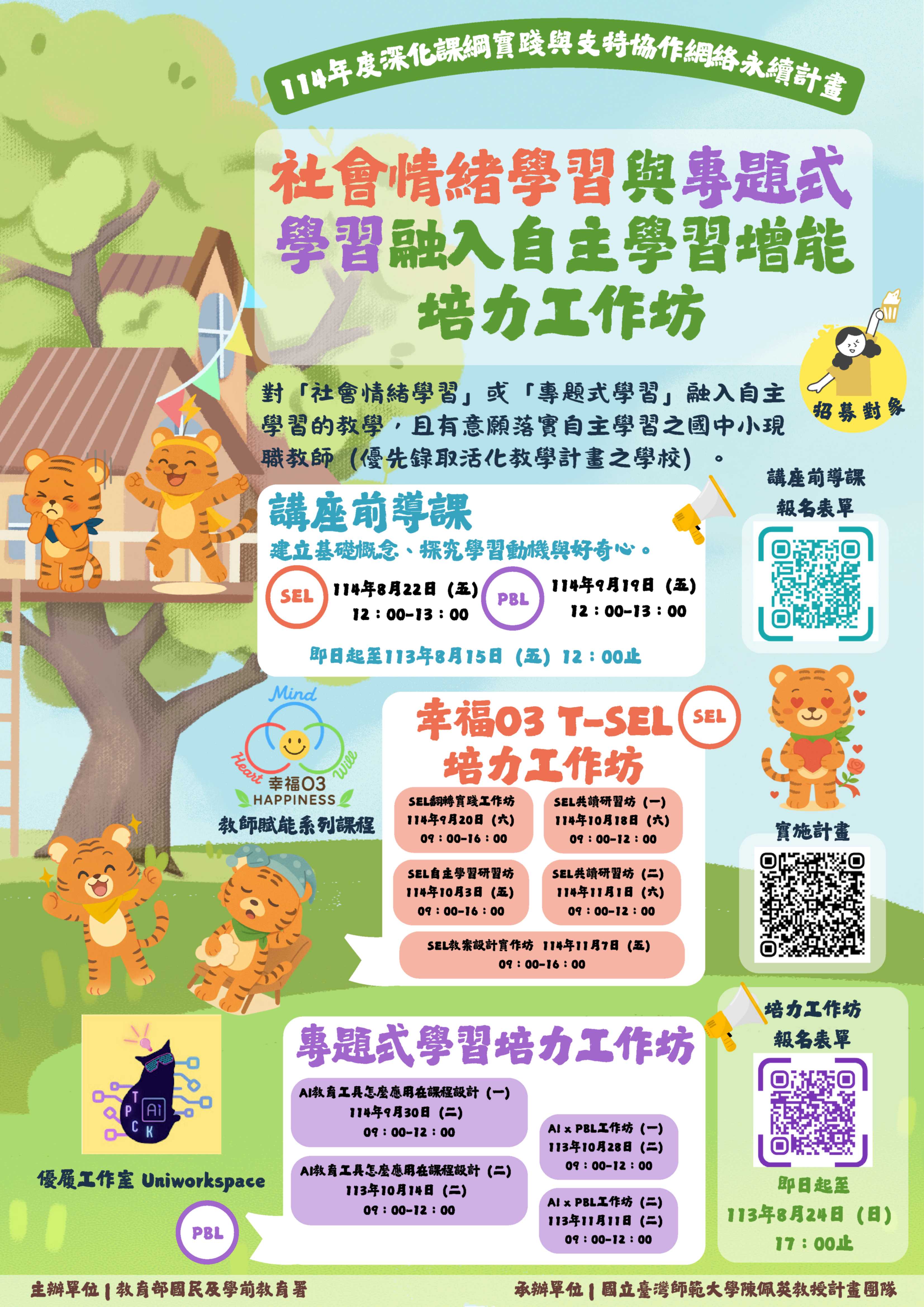 二、旨揭計畫採兩階段報名,為使參與教師了解「社會情緒學 習(SEL)」與「專題式學習(PBL)」融入自主學習之增 能培力工作坊內容,分別就前開主題辦理講座前導課程,請有意願參與教師分別報名講座前導課程及工作坊,將優 先錄取可全程參與者。辦理資訊簡述如下: