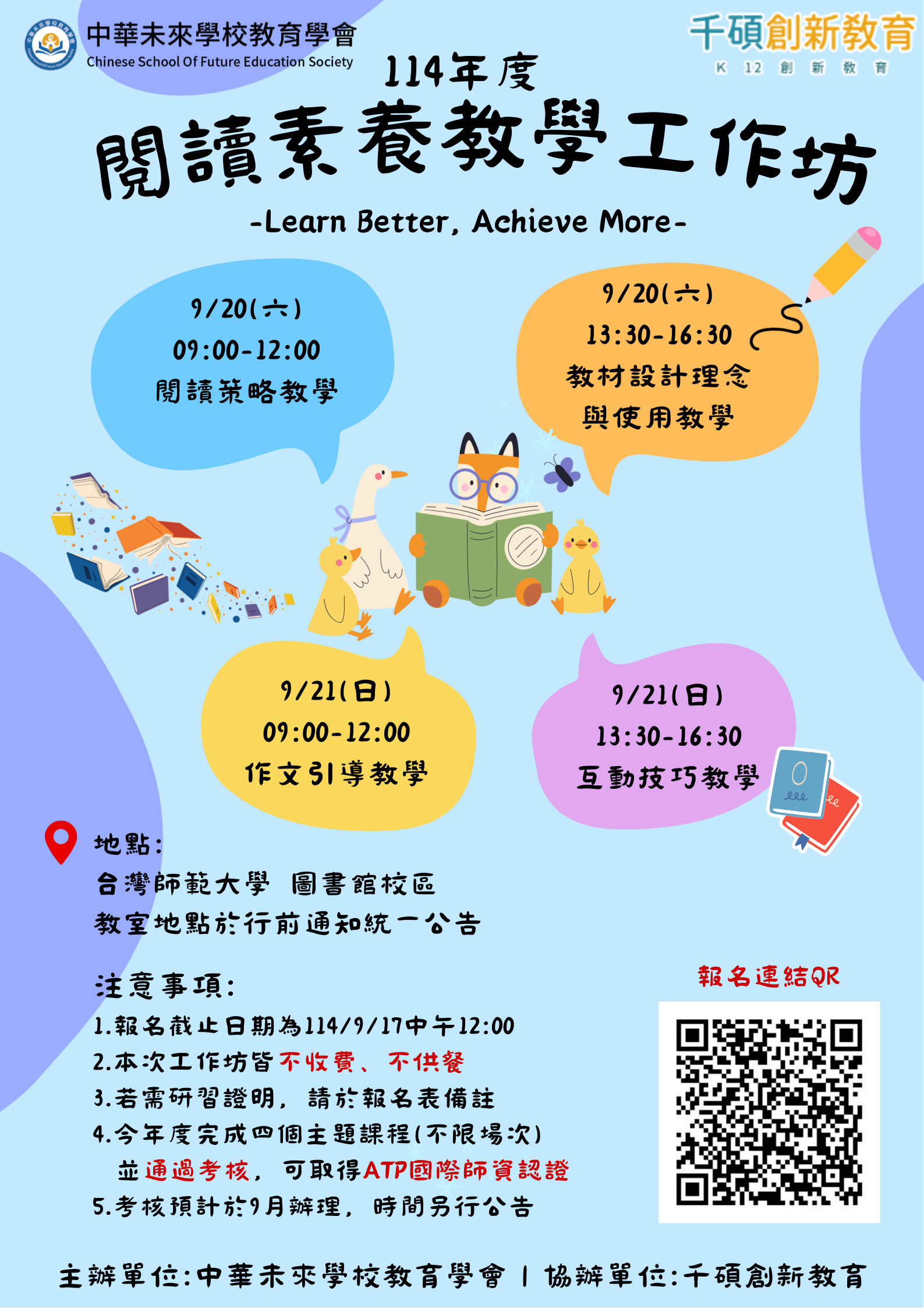 一、為提升教師素養導向教學能力,強化閱讀理解教學專業,中華未來學校教育學會特辦理「ATP素養導向閱讀師資培訓工作坊」。