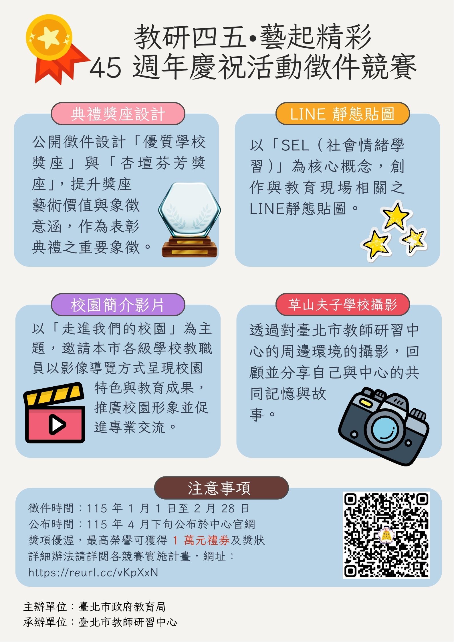一、臺北市教師研習中心將於明年迎來創立45週年慶。為紀念 此一重要里程碑,週年慶系列活動將回顧四十五年來的發 展歷程與教育成果,並規劃多元慶祝內容。期盼藉此凝聚 教育專業能量,共同開創教育的嶄新未來。配合本中心45 週年慶,規劃辦理4項競賽活動,以凝聚教育專業能量並展 現創新成果: